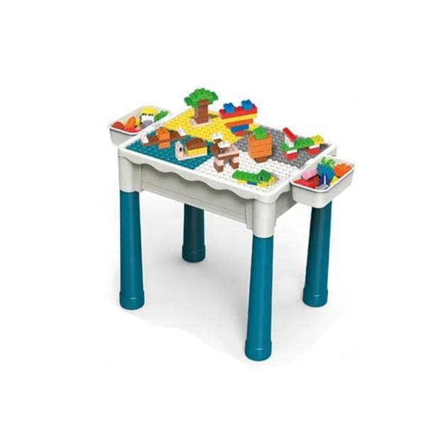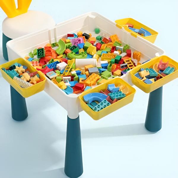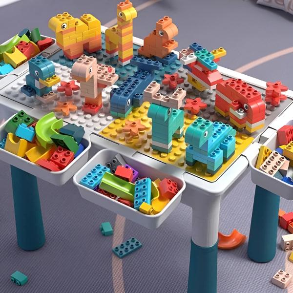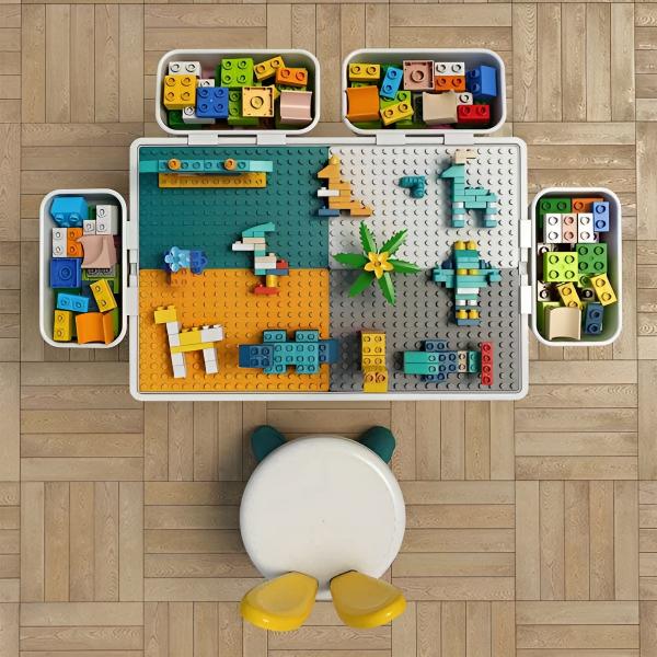 Der Tisch ist beidseitig verwendbar, wobei eine Seite für das Zusammensetzen von Blöcken vorgesehen ist und die andere eine flache Oberfläche aufweist.